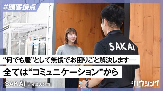 住まい手のための“何でも屋”として、ご自宅のお困り事を無償で解決します―。SAKAI(大分県大分市)は、迫りくる人口減や住宅着工数の減少に備え、ストック事業に力を注ぐ。同社社員が年間を通じて、県内に約500棟あるOB施主邸を訪問し、御用聞きする。「お家のかかりつけ医」として、その名の通り、住まいに関わるあらゆる相談事を受けながら、建てた後も住まい手と永続的に関係性を深めることで、地域で選ばれる工務店を目指す。本紙は6月下旬、市内にある築6カ月の『O邸』への自宅訪問に同行取材した。