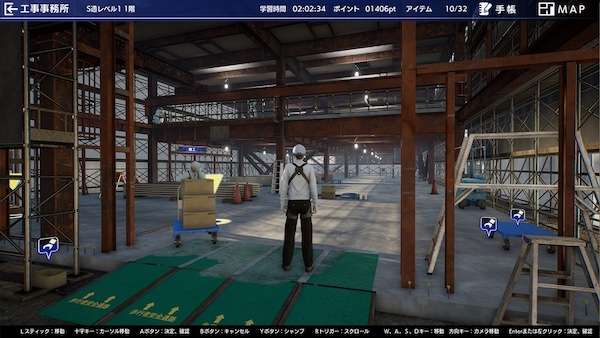 アバターを主人公としたゲームライクなUIでバーチャル現場内(現時点ではRC/S造4ステージ)を自由に探索し、先輩や職長、作業員からのリクエストやアドバイス、解説資料等を確認しながら随所で発生する問題点を解決していく。バーチャル現場内で発生する60問のクイズをクリアして経験を詰むと、240問のドリルが用意されている。ステージ・ドリルは随時追加予定とする。