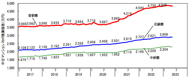 首都圏の中古マンション価格は、前月比0.3%減の4838万円と小幅ながら3カ月連続下落した。