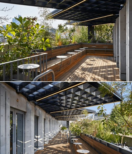 4階はスペースの半分以上が屋外となっており、代々木競技場や緑豊かな代々木公園を眺めることができるなど、都会にいながらも自然を享受できる。デッキ貼りのテラスには、ベンチやテーブル、カウンター設置。壁面の一部は解体した躯体をあえてむき出したまま残し、リノベーション前後の新旧の対比を随所に見せることで魅力的な雰囲気を演出している。