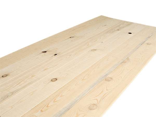 緻密で硬質な欧州アカマツに帯鋸目加工をほどこしてアンティークな風合いを表現。ブルーステインや抜け節、虫食い痕、割れや入り皮などの欠点をあえて残し、ノコギリで挽いたような荒々しい表情に仕上げた。着色塗装やダメージ加工を追加することで古材風の雰囲気を強調することもできるとする。