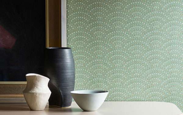 壁紙は「AZZURA(アズーラ)」4デザイン20点。アールデコのパターンにインスパイアされた扇形デザインの「サンストーンウォールペーパー」6色などを揃える。