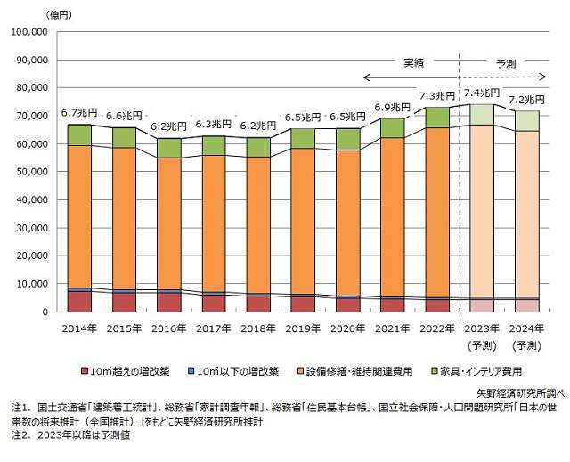 分野別にみると、「増改築に関わる費用」(10㎡超+10㎡以下増改築工事)が前年比3.6%減、「設備修繕・維持管理費」が同6.6%増、「家具・インテリア等」が同6.4%増となった。
