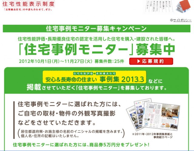 一般社団法人住宅性能評価・表示協会は、2013年3月に刊行予定の「事例集」に掲載するための施主モニターを募集している。