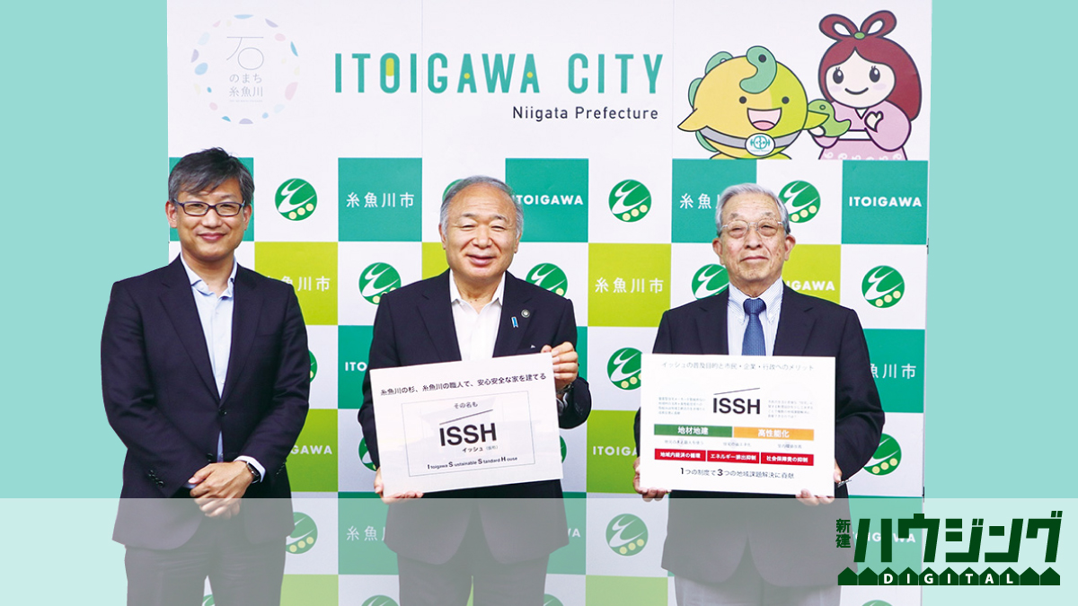 独自の基準による住宅認定制度「ISSH(イッシュ:Itoigawa Sustainable Standard Houseの略)」を運用する糸魚川商工会議所と糸魚川市は事業協力協定を締結し、7月5日に市役所で調印式を行った。