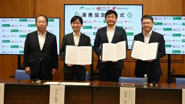 宮崎市とソーラーフロンティア(東京都千代田区)、出光興産(東京都千代田区)は7月19日、「ゼロカーボンシティみやざき」の実現に向けた連携協定を締結した。本協定に基づき、3者は相互に連携、協働し、脱炭素社会の実現とレジリエンス強化のための効果的な施策を構築していく。