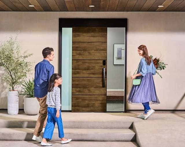 YKKAP「M30 顔認証自動ドア」。ベビーカーを押しながら、子どもの手を引きながら、買物の荷物を持ったまま、などいつもで出入りがスムーズにできる