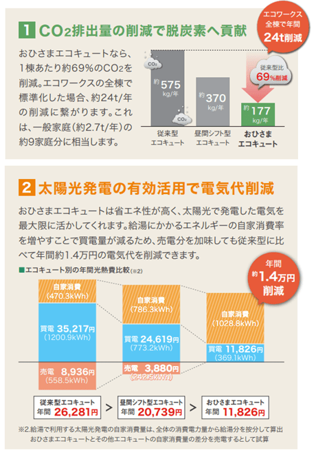 おひさまエコキュートのCO2排出量は年間約177kgで、従来型エコキュート(年間約575kg)から約7割の削減となる。同社が全棟に導入した場合、一般家庭9家庭分に相当する年間24tのCO2を削減できるとしている。また、給湯にかかる電気料金も、買電分を含めて従来型よりも年間1.4万円の削減になると試算している(下グラフ)。