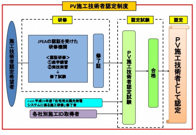 認定試験は13年度から年1〜2回、全国8カ所で開催する予定。受験資格は、前述の研修修了者やそれと同等の知識・技能をもっていることが認められる者(各メーカーの施工ID取得者など)。認定試験の合格者を「PV施工技術者」と認定し、認定証を交付する。