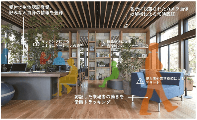 共同実験では、両社従業員や取引先など一部関係者が、検証場所である1階シェアオフィス入口の専用機器で生体認証登録と好みなど自身の情報を登録。シェアオフィス内に設置された生体認証センサとカメラで常時認証を行い、照明機器やスピーカーなどの住宅機器と連動して好みの音楽を流すなど、個人特定精度の高さとパーソナライズ化された住環境の価値を検証する。