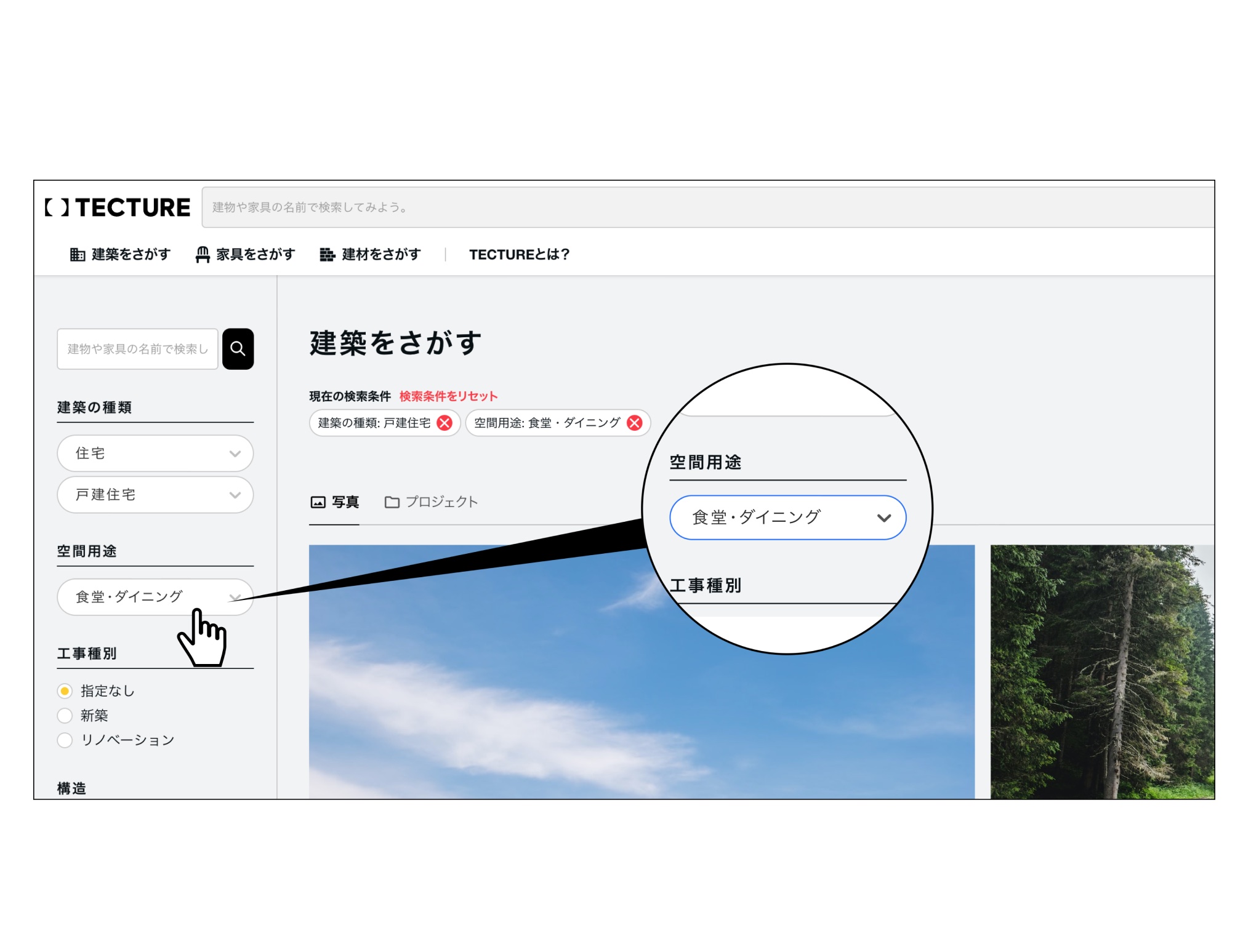 そして会社設立の翌年(2020年)の6月、満を持して次世代型検索サービス「TECTURE」を開始。先行して「TECTURE MAG」に搭載していた「プロダクト表示機能」を強化し、空間デザイン事例の検索、建材・家具の商品検索、メーカーへの問い合わせまでをワンストップに行うことができるサービスとして展開した。