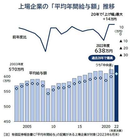 帝国データバンク(東京都港区)は7月25日、上場企業約3800社を対象に実施した「平均年間給与」動向調査(2022年度決算)の結果を発表した。上場企業の2022年度の平均年間給与は、2021年度から14万円(2.2%増)アップし、638万円だった。2年連続増加し、平均給与額・増加額ともに過去20年間で最高となった。国内の平均給与額443万円より約200万円高い水準にある。