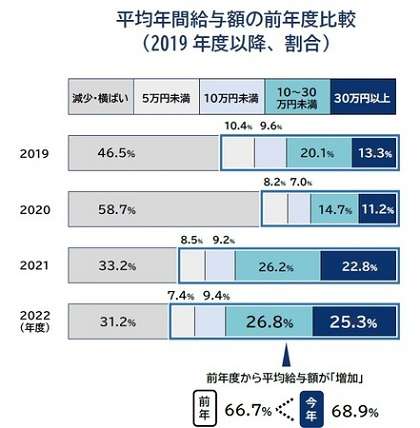 平均給与額が前年度から増加した上場企業は、2.2ポイント増の68.9%を占め、賃上げの動きが広がっている。前年度から30万円以上増加した企業は25.3%で、上場企業の4社に1社が大幅な賃上げを実施した。輸出企業を中心に円安の影響で好業績となった企業が多かったほか、物価高や人手不足による賃上げ機運が急速に高まったことで、上場企業の平均給与額は上昇傾向にある。