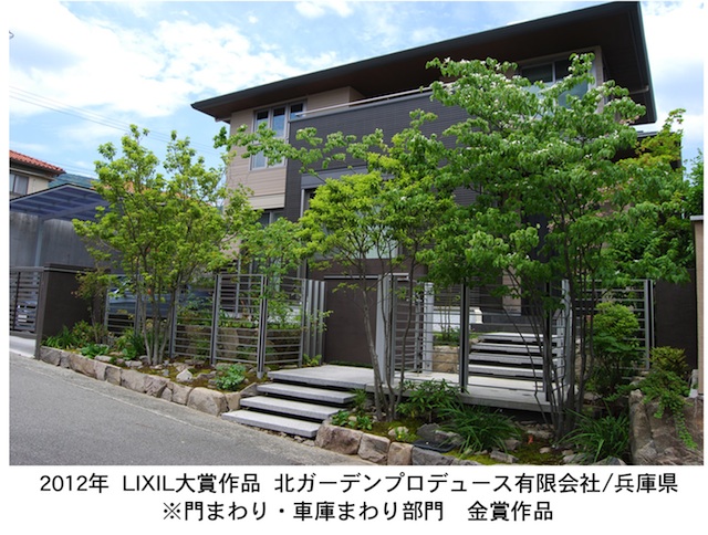 最も優れた施工事例として「LIXIL大賞」を受賞したのは、北ガーデンプロデュース(兵庫県伊丹市)。門まわり・車庫まわり部門からのエントリー作品で、建物とエクステリア、自然素材、植栽の調和の妙が評価された。審査委員長の古橋宜昌氏(エクステリア&ガーデンアカデミー東京校学長)は「一見すると開放感のあるオープンスタイルのように見えるが、門扉とフェンスがしっかりと設置してあり、セキュリティー面でも安心なクローズドスタイルとなっている。門扉やフェンスが主張しすぎない商品コンセプトを見事に活かして計画されている」とコメントした。