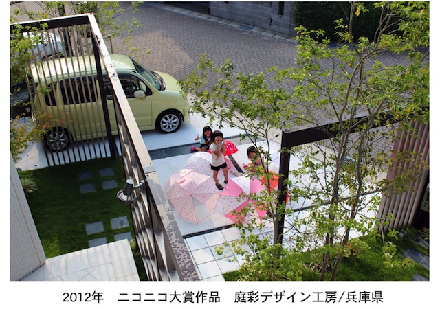笑顔あふれるエクステリアライフを表現した「ニコニコ大賞」には、庭彩デザイン工房 (兵庫県姫路市)が輝いた。この作品は、門回り・車庫まわりでも銀賞を受賞。傘の色彩でエクステリアの縁を際立たせた演出、雑木林のさわやかさをイメージさせる樹種・樹形の選定や配置が高評価を得た。