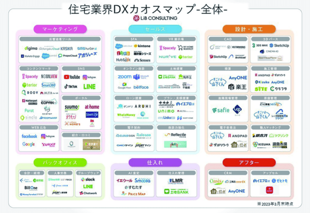 DXのためのサービスは百花繚乱だ。上の図はリブコンサルが発表した「住宅DXカオスマップ」。