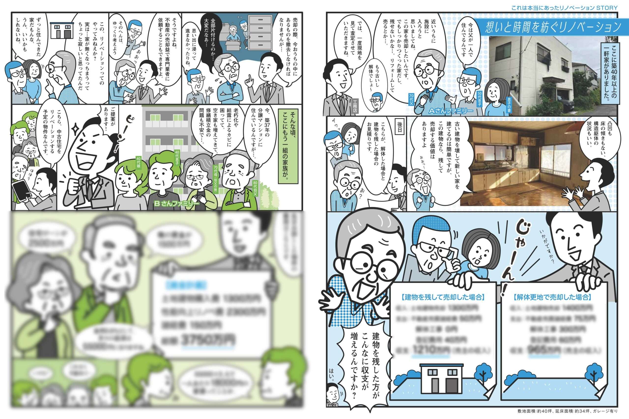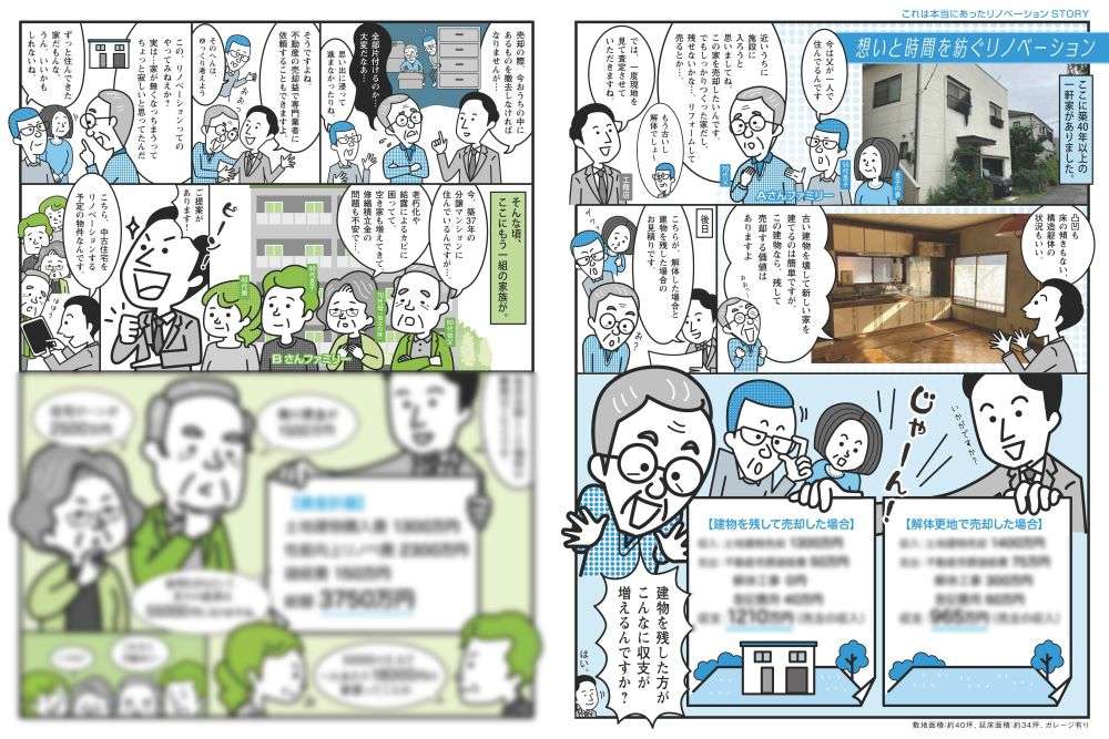 売主・買主・工務店それぞれのメリットをストーリー仕立てで紹介するマンガ『本当にあったリノベーションSTORY』(本誌 見開き2ページ分)PDFデータを無料でダウンロードできます。リノベ検討顧客への提案資料としてご活用ください。