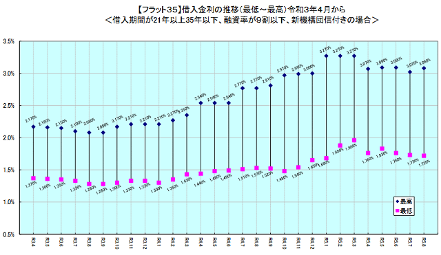 返済期間21年以上35年以下の最低金利は、融資率9割以下が1.72%、9割超が1.86%と、いずれも前月から0.01ポイント下がり、3カ月連続で下降した。最高金利は、9割以下が3.08%、9割超が3.22%で、前月から0.06ポイント上昇した。