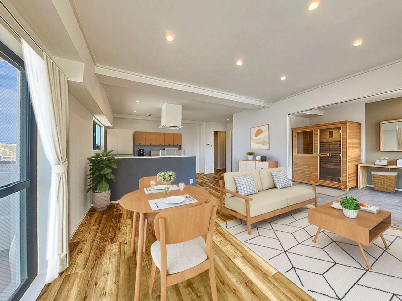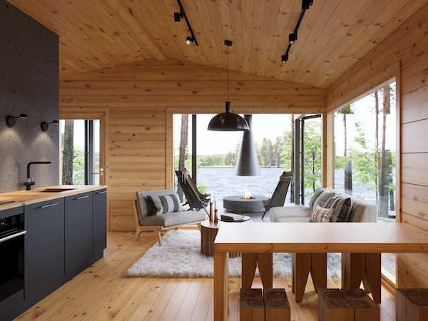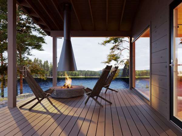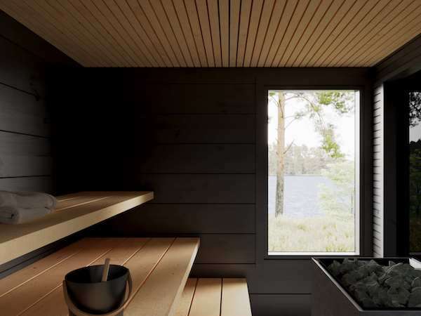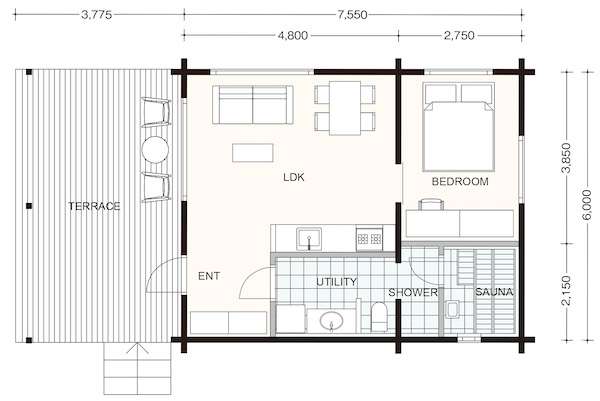 「ヒュッティ」はフィンランド語でコンパートメントの意。 サウナ室、LDK、寝室からなる約45㎡の空間で、大きな窓と外気浴が楽しめる広いテラスが特徴となっている。