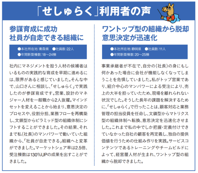 「せしゅらく」は、注文住宅事業に特化した会員限定のWEB サービス。山口さんがリアル・オンラインを用いて、個や組織力の強化を目指し、学習コンテンツを提供。顧客満足度の向上と工務店の成長を好循環させることが目的だ。