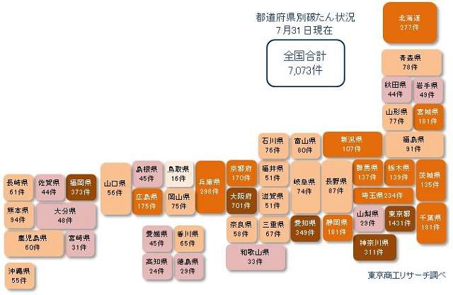 東京商工リサーチ(東京都千代田区)は8月1日、7月末時点の「新型コロナ」関連の経営破たん(負債1000万円以上)が、全国で累計6738件(倒産6547件、弁護士一任・準備中191件)にのぼったと発表した。負債1000万円未満の小規模倒産を含めると累計7073件。
