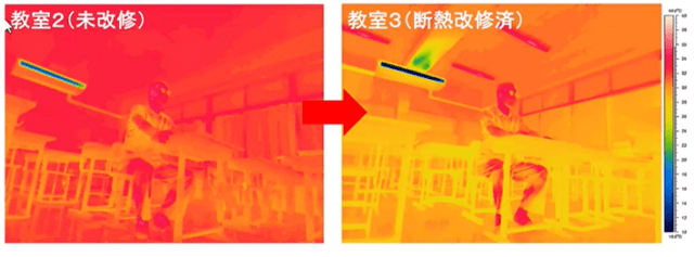 また、さいたま市内の小学校で実施した温熱環境計測結果を動画で公表。エアコンを設置・使用した教室で、断熱改修をした場合と改修をしなかった場合の室温などの変化について比較している。実験の結果、未改修の教室では天井付近の気温が40~42℃に達し、冷房の効率も悪かったが、天井の断熱改修済みの教室では、天井などからの熱侵入が5分の1に抑えられ、室内気温を素早く下げることができたことを明らかにした。