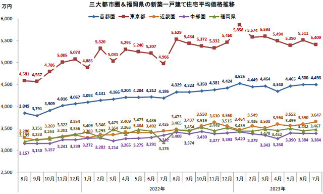 中部圏は、前月比3.6%減の3754万円と2カ月連続の下落。愛知県は3785万円(3.6%減)と2カ月連続で下落した。前年同月比でも6.0%減と低い水準で、土地・建物の平均面積も縮小している。名古屋市は3877万円(2.7%減)と3カ月連続下落。平均建物面積は前月比プラスとなったが、土地面積は5.5%縮小した。