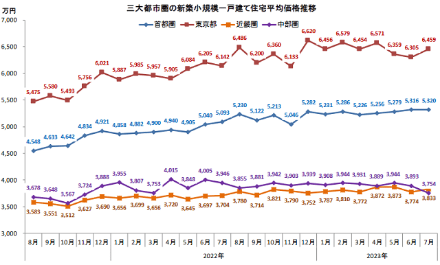 新築小規模一戸建て住宅の平均価格は、首都圏で前月比0.1%増の5320万円と4カ月連続で上昇した。東京都は6459万円(2.4%増)と反転上昇。神奈川県は4637万円(3.6%減)と反転下落した。千葉県は4352万円(2.2%増)、埼玉県は4376万円(2.6%増)といずれも反転上昇した。東京都が上昇に転じたものの神奈川県の下落が響き、全体ではわずかな上昇にとどまった。また、東京都では分譲戸数が23区・都下ともに減少し、全体で前月比10.7%減となっている。