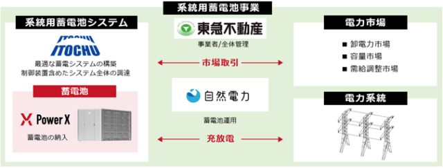 同事業では、パワーエックスの蓄電池システム(定格出力1.8MW、定格容量4.9MWh)を採用。パワーエックスの系統用蓄電池システムの導入に向けて、伊藤忠商事が蓄電システム全体を設計・構築するアレンジメントを担うとともに、パワーエックスの蓄電池システム以外にも制御装置などの調達を担う。自然電力は東急不動産からの委託を受け、自然電力が開発・運用するアグリゲート・エネルギー管理システム「Shizen Connect」を活用して当該蓄電池を制御し、これにより生み出される調整力を、卸電力市場、需給調整市場、容量市場といった各電力市場で運用する。