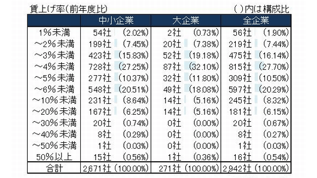 賃上げ率は、「3%以上4%未満」(27.7%)が最多。次いで、「5%以上6%未満」(20.2%)、「2%以上3%未満」(16.1%)となった。連合の2023年春闘では、定昇相当分を含む5%程度の賃上げ方針が示されたが、賃上げ実施企業のうち、「5%以上」の賃上げ率を達成したのは36.3%だった。賃上げ率「5%以上」を規模別に見ると、大企業が28.7%(271社中、78社)に対し、中小企業は37.0%(2671社中、990社)と、中小企業が8.3ポイント上回った。
