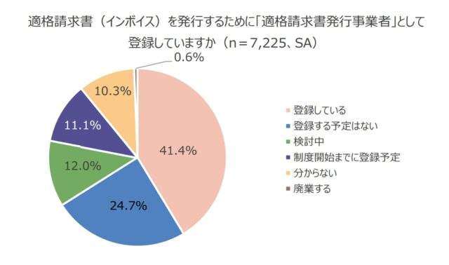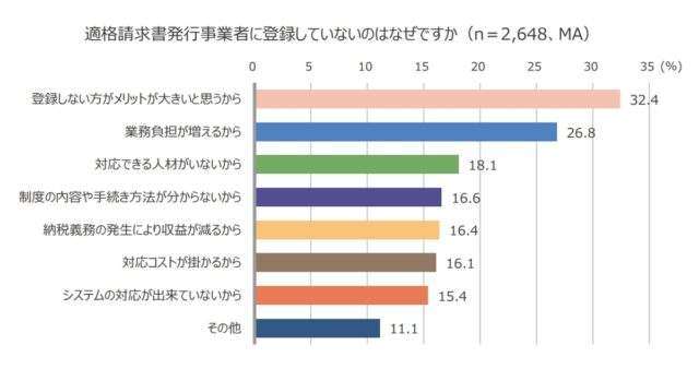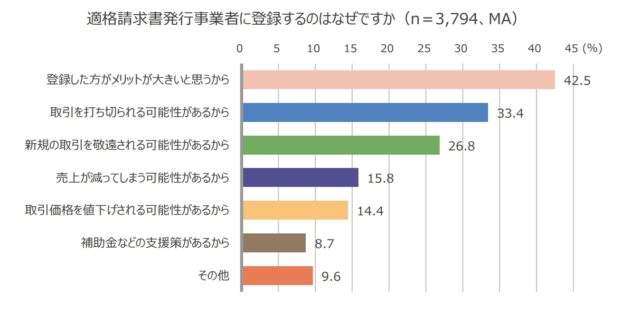 一方、適格請求書発行事業者へ「登録している」(41.4%)、「制度開始までに登録予定」(11.1%)と回答した経営者に登録理由を聞くと、「取引を打ち切られる可能性があるから」(33.4%)、「新規の取引を敬遠される可能性があるから」(26.8%)と、取引先への影響を危惧する回答が上位に挙がった。
