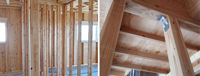 主に壁枠組の1・2階のたて枠(一部を除く)ならびに上下枠、頭つなぎに福島県産スギを使用。使用率は構造材の約20%となる。