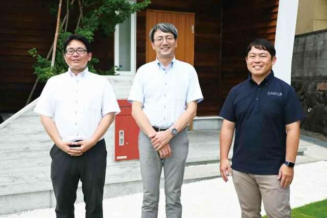 中央が表孝典社長、右が注文住宅の新築事業を統括する西田宏則さん。左は施主として同社の住宅に惚れ込んだのをきっかけに社員となった営業担当の瀬戸山武さん