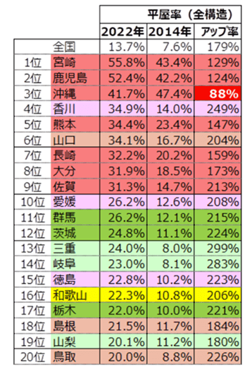 2022年に着工された3階建て以下の新築住宅のうち、もっとも平屋率の高かった都道府県は「宮崎県(55.8%)」だった。以下、2位「鹿児島県(52.4%)」、3位「沖縄県(41.7%)」と続いた。九州地方では、福岡県を除きすべての県で平屋率が3割を超え、上位トップ10にランクインした。台風の影響を受けやすい地域で平屋率が高くなった。