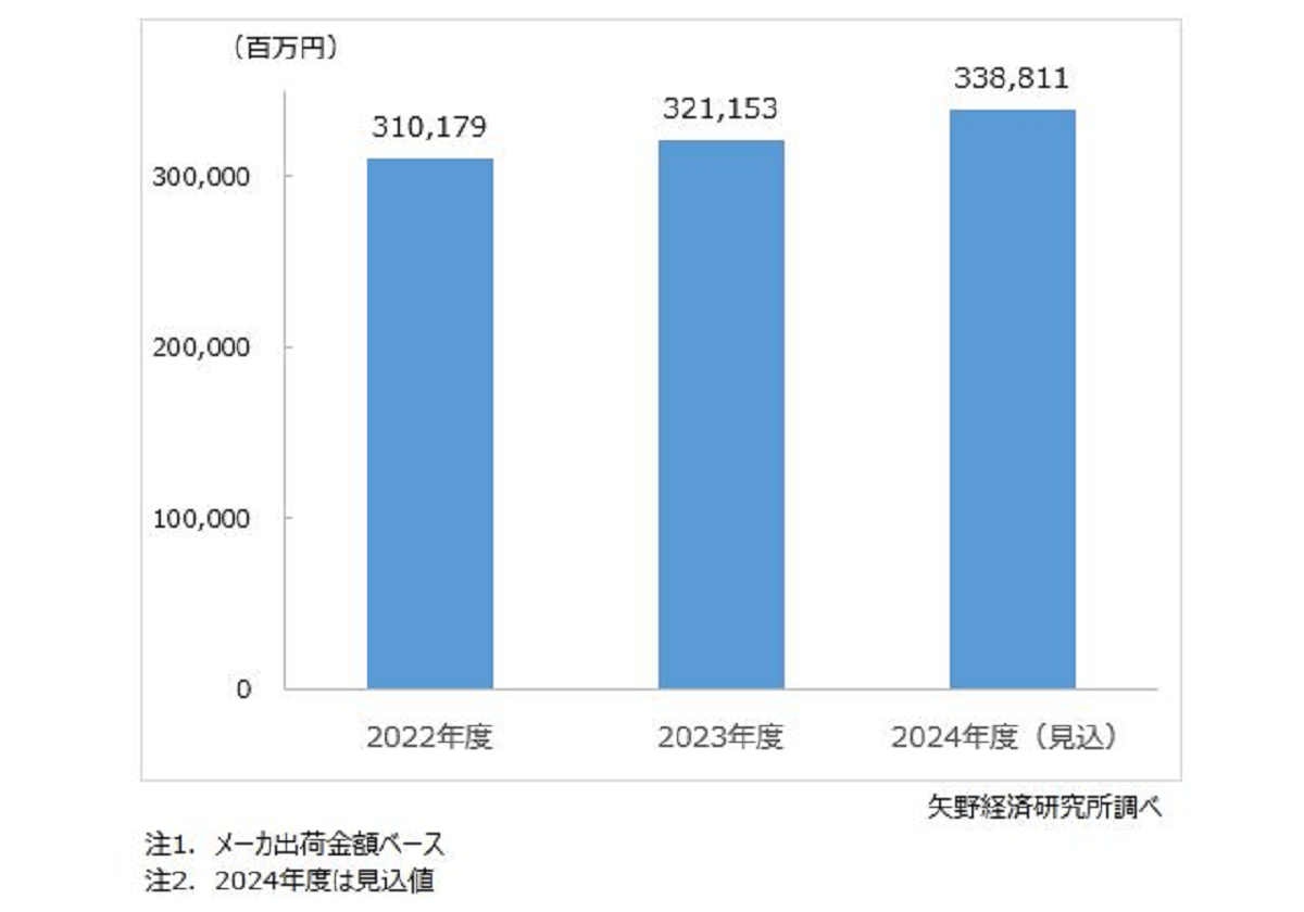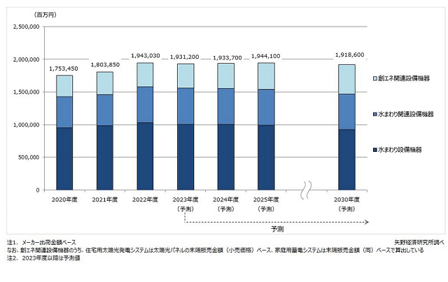 矢野経済研究所(東京都中野区)は8月23日、国内の住宅設備機器市場の調査結果を発表した。2022年度の主要住宅設備機器(水まわり設備機器+水まわり関連設備機器+創エネ関連設備機器)の市場規模は、前年度比7.7%増の1兆9430億円と推計した。