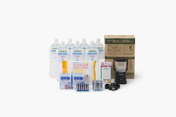 8アイテムは、水(2L×7本)、ポータブルトイレ(20枚入り)、ペーパー歯磨き(30包×2パック)、体拭き用ウェットタオル(12枚入り)、ランタン、ヘッドライト、スマートフォン用充電器、電池(単1×9本[ランタン]、単3×15本[スマホ充電器×12本][ヘッドライト×3本])で税込2万1450円。