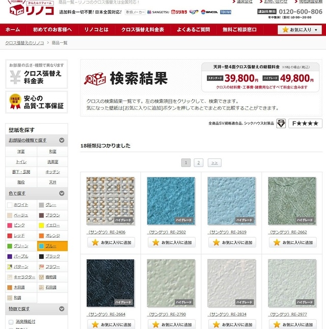 定額リフォーム販売サイトの「リノコ」(運営:ユニクエスト・オンライン、大阪府大阪市)は12月5日、1200種類の壁紙をそろえた「壁紙(クロス)張替え」ページをリニューアルした。 11月にサイト訪問者・利用者の検索ワードなどを調査したところ、検索数・注文数ともに「壁紙張替え」が1位となったことから、壁紙カテゴリを刷新。9種類だった品揃えを大幅に強化した。6帖の壁紙張り替え価格は税込3万9800円。