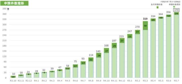インボイス制度の円滑な導入に向けた関係府省庁会議がこのほど開かれ、登録申請状況などについて関係省庁から報告があった。国税庁の報告によると2023年7月末時点の累計申請件数は約370万件。約300万者の課税事業者のうち9割超に当たる約278万者が申請したほか、免税事業者のうち約92万者が申請を行っている。