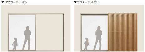 さまざまな住宅外観、デザイントレンドに対応できるよう、室外の袖壁部に取り付ける格子”アウターセット”に「20mm×30mm縦格子」「30mm×50mm横格子」「横格子ルーバー」をラインアップ。これにより、従来は「30mm×50mm縦格子」の1種類のみだったが、バリエーションが4種類に増えた。