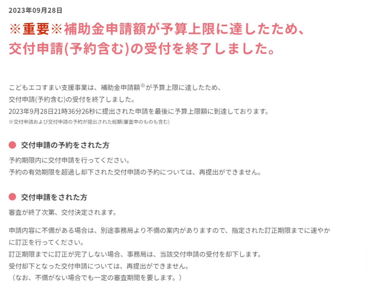 なお、住宅省エネ2023キャンペーンはそれぞれの事業ごとに、補助金申請額が予算上限に達し次第、交付申請の受付を終了する。従ってこどもエコすまい支援事業が受付を終了した場合でも、「先進的窓リノベ事業」「給湯省エネ事業」における予算が上限に達していない場合は、先進的窓リノベ事業、給湯省エネ事業へは交付申請を行うことができる。