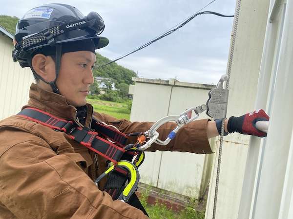 今回のリニューアルによりワイヤーへの装着手間が減り、1つの金具をワンタッチで取り付けるだけで完了。はしご頂上部での脱着がスムーズになることで作業者のストレスが減らせる。