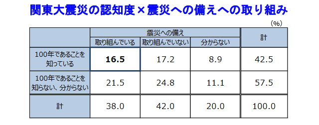 震災の備えに「取り組んでいる」企業は38.0%だった。しかし「100年であることを知っている」かつ震災への備えに「取り組んでいる」企業は16.5%と、2割以下であることがわかった。従業員数別でみると「100年であることを知っている」かつ「取り組んでいる」企業は、従業員50人以下で16.5%を下回り、51人以上は16.5%超えとなった。「1000人超」は38.9%と最も高く、従業員数が多いほど認知度や備えに取り組んでいる傾向がみられた。