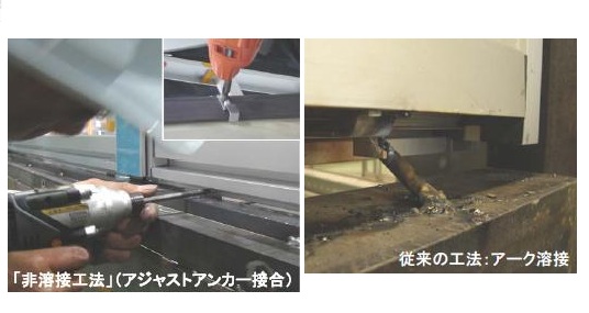 新工法は、専用のアジャストアンカーを打鋲(だびょう)ピンとビス止めで固定するという、無火気かつ施工性に優れたもの。ビル用サッシの施工におけるアーク溶接の問題点―火災リスク、鉄筋材や高電圧電源の必要性、雨天時の感電リスクーを改善し、施工者の負担を大幅に軽減する。