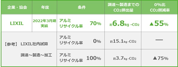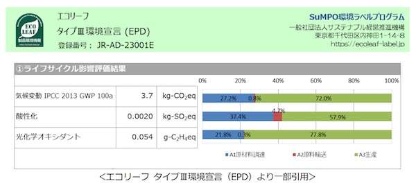 新地金を使用せず、リサイクルアルミに転換することで、新地金を製錬する際のエネルギー消費を抑え、CO2排出量を97%削減。 取得したエコリーフ環境ラベルのライフサイクル影響評価では、原材料調達から輸送、生産までのCO2排出量を約3.7kgに抑えていることを開示しており、この数値を従来のアルミ形材のCO2排出量と比べると約75%削減できる計算になるという。