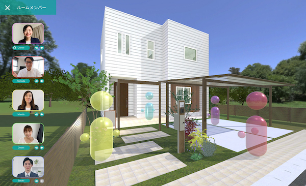 メタバース空間には最大5人まで同時接続が可能で、ビデオ通話機能を使って顧客の要望を聞きながらリアルタイムで操作し、それぞれのアバターは空間内を自由に動き回って外から・中からの見え方などをさまざまな角度から確認することができる。