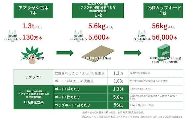 アブラヤシ廃材を利用した中密度繊維板を1枚使用すると500mlペットボトル約5600本分の体積のCO2を削減できる計算になり、10枚使ってカップボードを製作すると同寸法の一般的な繊維成形材使用に比べペットボトル5.6万本分(56kg-CO2/台)の温室効果ガス削減に相当するという。