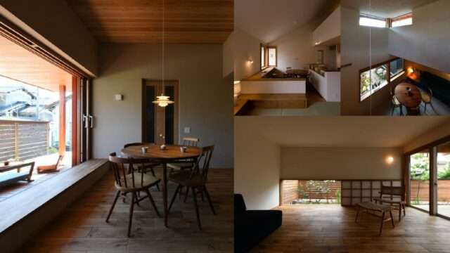 「大真屋の家」。過密型立地に建つ事務所併用住宅。土地は約90坪と広大だが、東側に8台分の駐車スペースがあるため、居住空間はそこまで大きくなく、わずかな庭とデッキ空間を重ねて配置した。東側から入る光をデッキ材、軒天の反射を利用して導光することで陰影のある室内空間を目指した。内部は[ダイニング→リビング→キッチン(水回り)→畳の小部屋]がつながる回遊性のある間取りとし、導光結果の違いにより、それぞれの部屋で陰影と居心地の違いを楽しめる