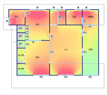 リヴアースでは、昼光利用のステップ1〜3を踏まえた上で、室内の照度シミュレーション[下図]を行い、ここで初めて照明設備の検討に入ります。