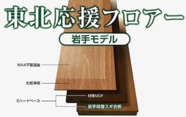 「東北応援フロアー」は、地域産材を使った「地産地消」で、東日本大震災からの復興を狙った製品。やわらかくキズがつきやすいスギに、強度の高いMDFを組み合わせることにより、耐久性やキズに対する強さなどを実現した。