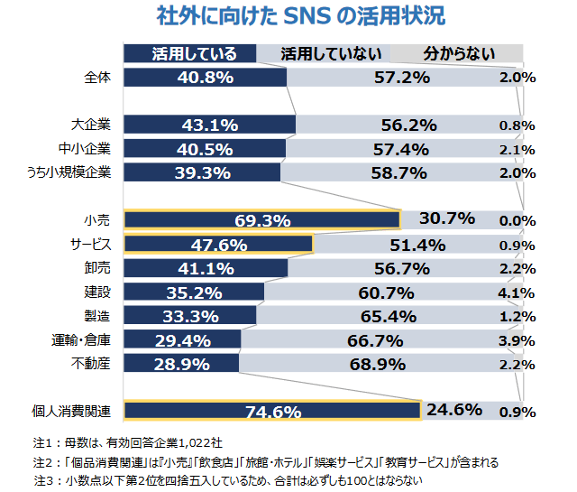 業界別では、活用割合が最も高いのは「小売」(69.3%)で、全体を28.5ポイント上回り突出している。「建設」は35.2%、「不動産」は28.9%で、いずれも全体を下回った。個人消費関連の業種(「小売」「飲食店」「旅館・ホテル」「娯楽サービス」「教育サービス」)は、74.6%と全体を33.8ポイント上回り、「BtoC(一般消費者向けビジネス)」企業の多くでSNSが活用されていることがわかった。